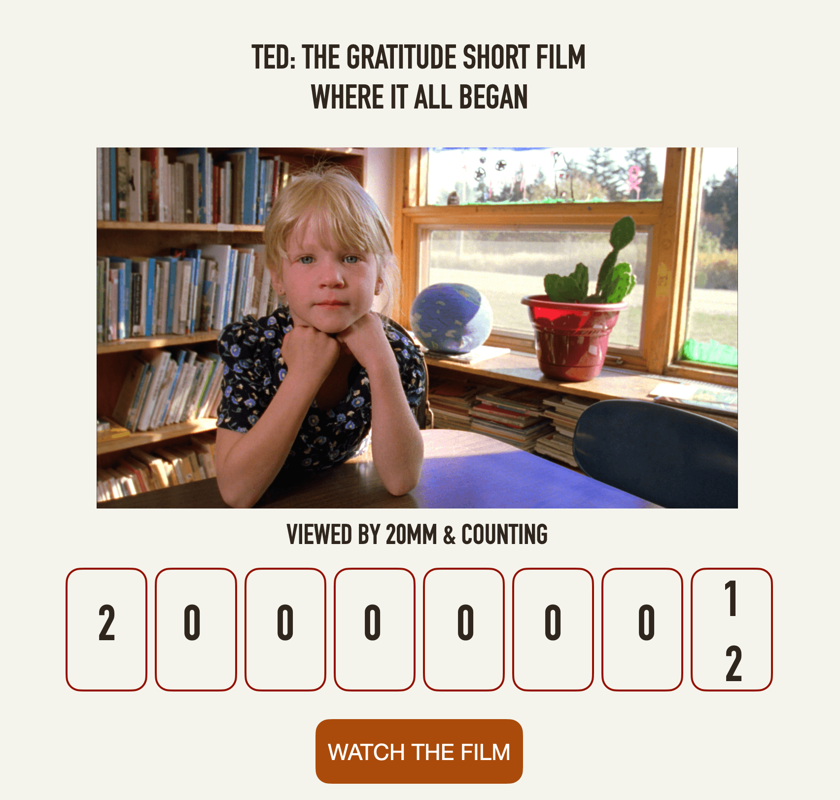 With the help of a generous Templeton Grant and strategic partner Oprah Winfrey, Louie Schwartzberg was challenged to produce statistical proof of the global impact of gratitude through the creation of 15 short films. This later evolved into a full-length feature film which toured the U.S. and ultimately premiered on his own streaming channel, Moving Art.